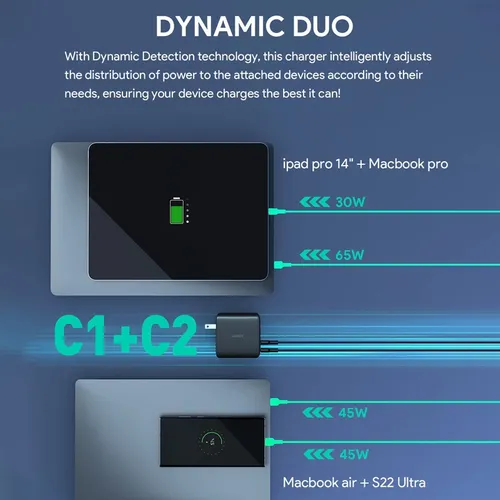 A 100W 4-Port PD wall charger with GaN power tech is powerful enough to charge laptops and other large-capacity devices. Supports both PD and Samsung super-fast charging, as well as, charging up to 4 devices via the built-in 3 USB-C and 1 USB-A ports. Easily store and travel while on the go, with its foldable plug design.