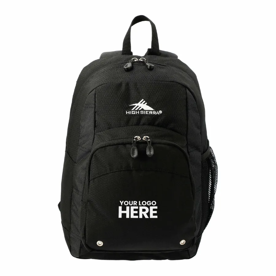 Constructed from a durable blend of nylon and Duralite, the High Sierra Impact Backpack features a spacious front-loading main compartment. It also includes a large gusseted front pocket for additional accessories, a cell phone pocket, and a mesh water bottle pocket, plus a handy organizer with pen pockets and a key fob. The backpack has contoured, padded shoulder straps and a cushioned back panel for comfortable wear, along with a grab-handle for carrying.