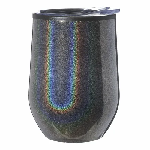 12 oz Iridescent Stemless Wine Glasses with Lid. Stainless Steel Exterior with Iridescent Color Coating and Black Plastic Interior. Press In Clear Titan Lid. Black EVA Bottom Pad. Easy-Grip Curved Body Design to Enjoy Your Wine, Coffee, Cocktails, Juices and More. Great for Outdoor Camping, Traveling, Office, Boating, Picnics, the Pool, the Beach or Patio Events. Best Gift Give Away Choices for Loved Ones and Special Occasions. Recommended Hand Wash Only