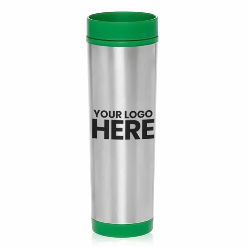 Custom Printed 16 oz. Slim Color Top Travel Mugs. Double Wall Plastic Inside, Stainless Outside. Spill Proof Twist-Turn Lid. Bottom Foam Pad to Avoid Sliding. Fits Most Standard Car Cup Holders. Hand Wash Only. Note: Do not microwave