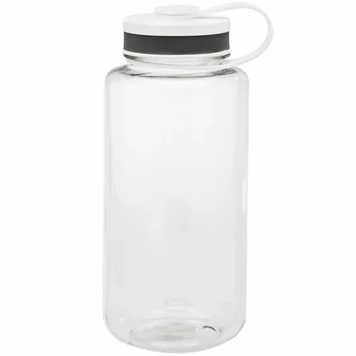 38oz Plastic Water Bottle. Wide Mouth Bottle with Screw on Cap. Color Matching Trim. Transparent Outer Wall