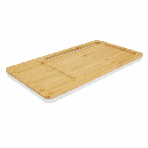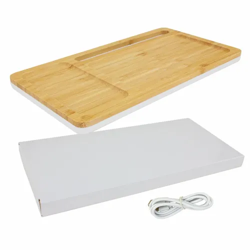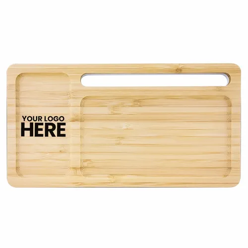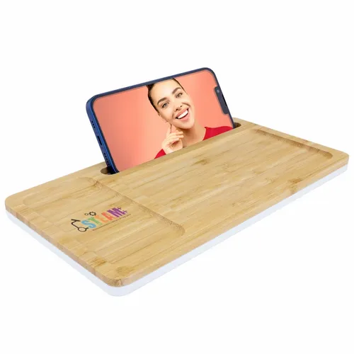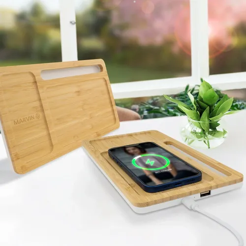 It's a bamboo-topped desktop charging phone tray. It will help maintain a tidy desktop, wirelessly charge a phone, and has an additional spot for business cards. The long and narrow groove is a convenient space to prop up a phone. It has a large visual space for branding and the natural color and modern design will match well with an office environment that is bright with life.