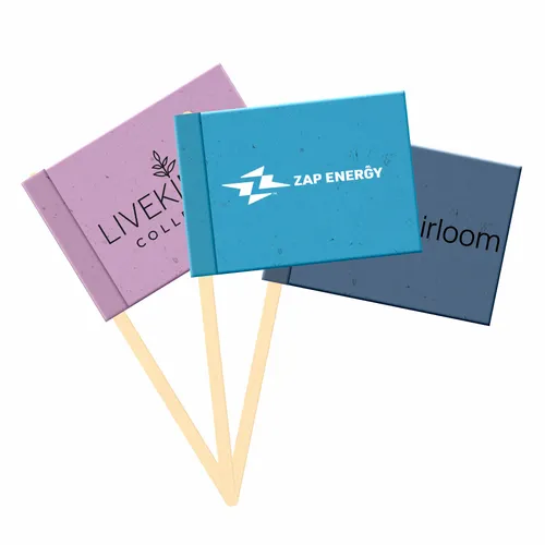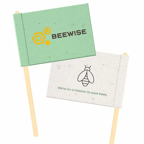 • Seed Paper Flags are the perfect eco-conscious detail for food, drinks, or event decorations. Lightweight and impactful, each flag carries your brand message while promoting sustainability. Guests can take them home, plant them, and grow wildflowers, reinforcing your brand long after the event.