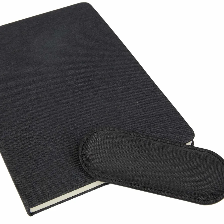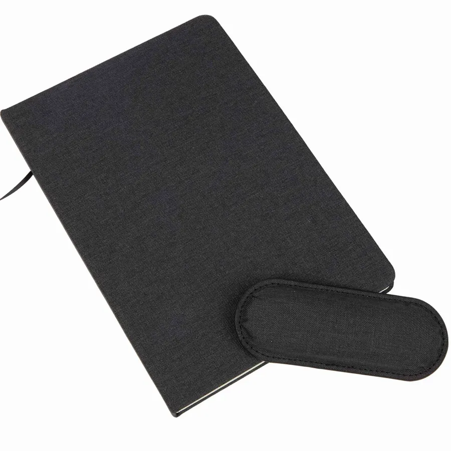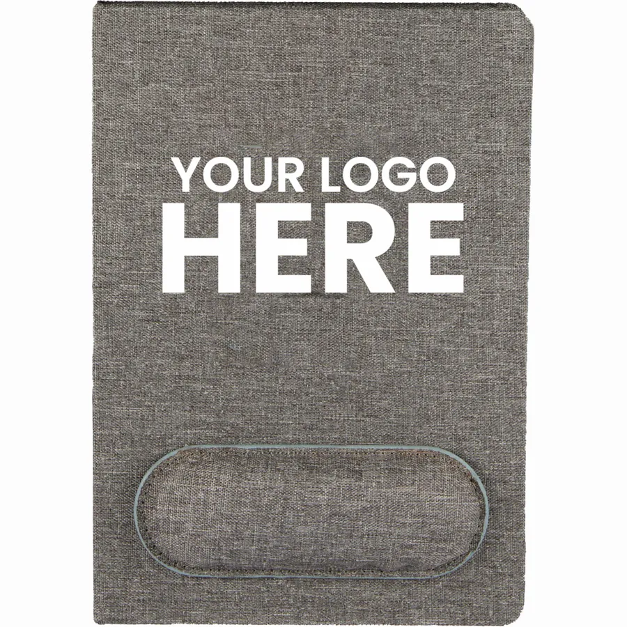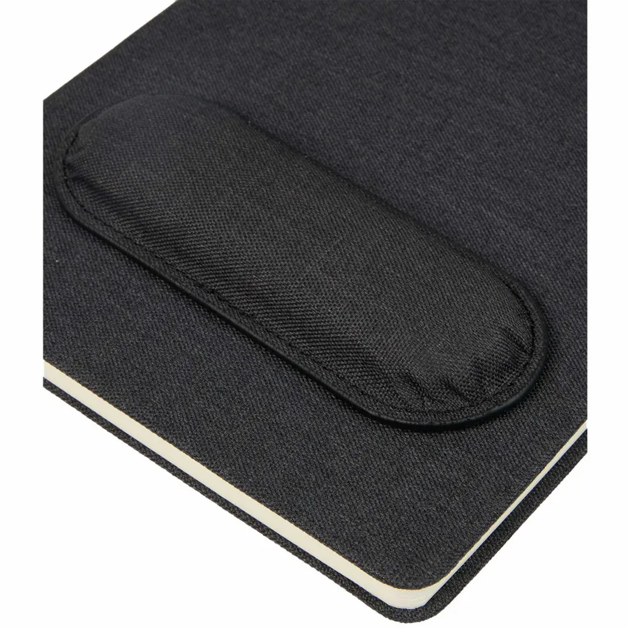 The 5.5 x 8.5 FSC Recycled Mouse Pad Bound Notebook is the ideal addition to your workday, blending comfort and functionality. Featuring a 100% recycled PET fabric cover, this notebook includes a unique matching magnetized wrist pad for comfortable scrolling. Inside, you’ll find 80 sheets of FSC recycled lined cream paper, perfect for eco-conscious note-taking. A grey ribbon page marker adds functionality, helping you keep track of important notes. Please note magnetic mouse pads are packed separately and removed from the notebook in the master carton. By choosing this notebook, you’re making a positive impact on the environment through a partnership with 1% For The Planet, as a portion of each sale supports environmental nonprofits.
