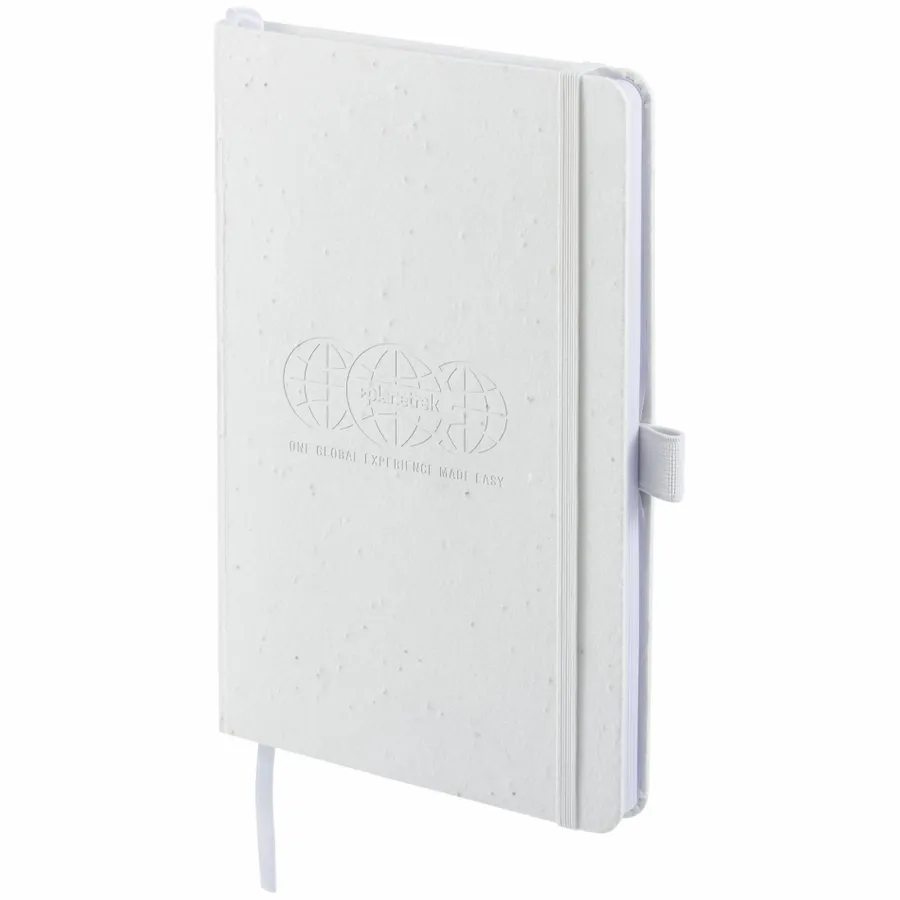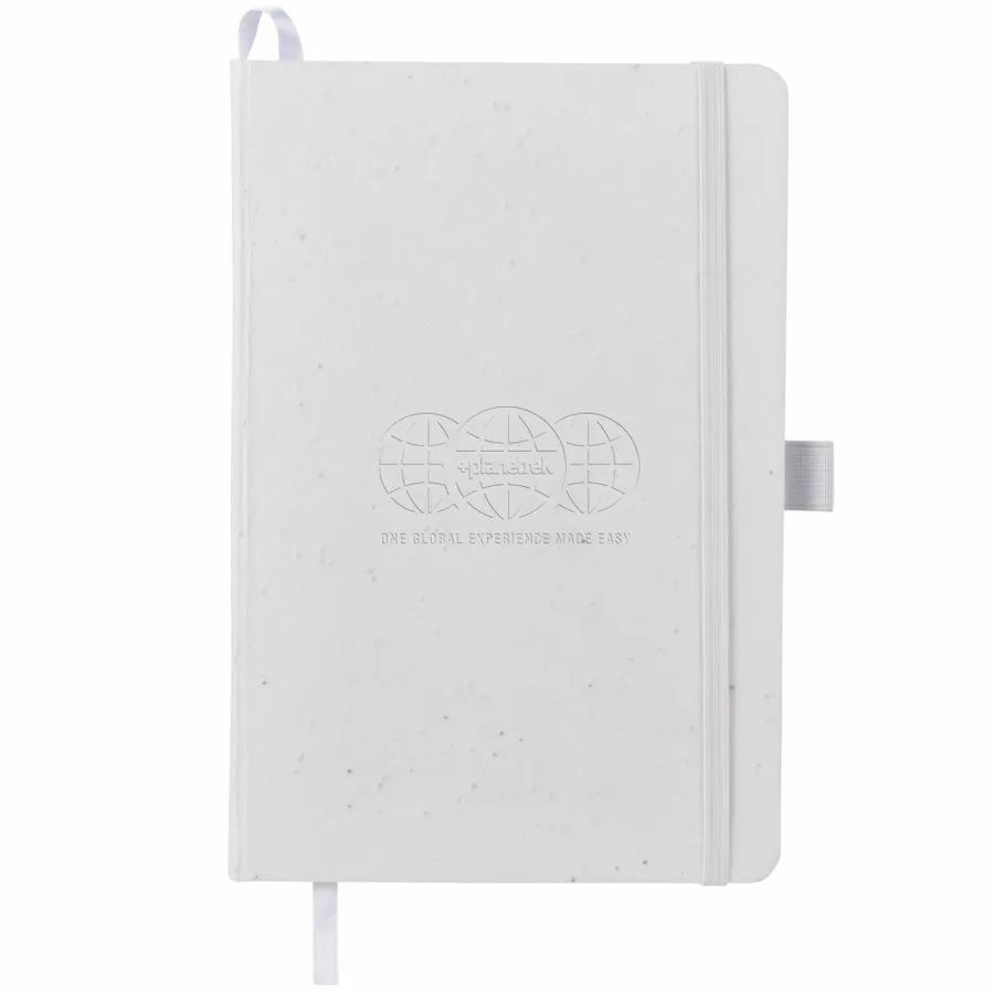 The 5.5 x 8.5 FSC Recycled Seed Paper Bound Journal features a biodegradable seed paper cover – made by mixing paper pulp with daisy seeds. The journal also includes 80 sheets of FSC- Certified Recycled lined paper. An elastic band, color-matching page marker ribbon, and a document pocket in the back provide exceptional organization when you’re on the move. The journal also features an integrated pen loop to securely hold your favorite pen. Through a partnership with 1% For The Planet, one percent of sales of this item are donated to environmental nonprofits.