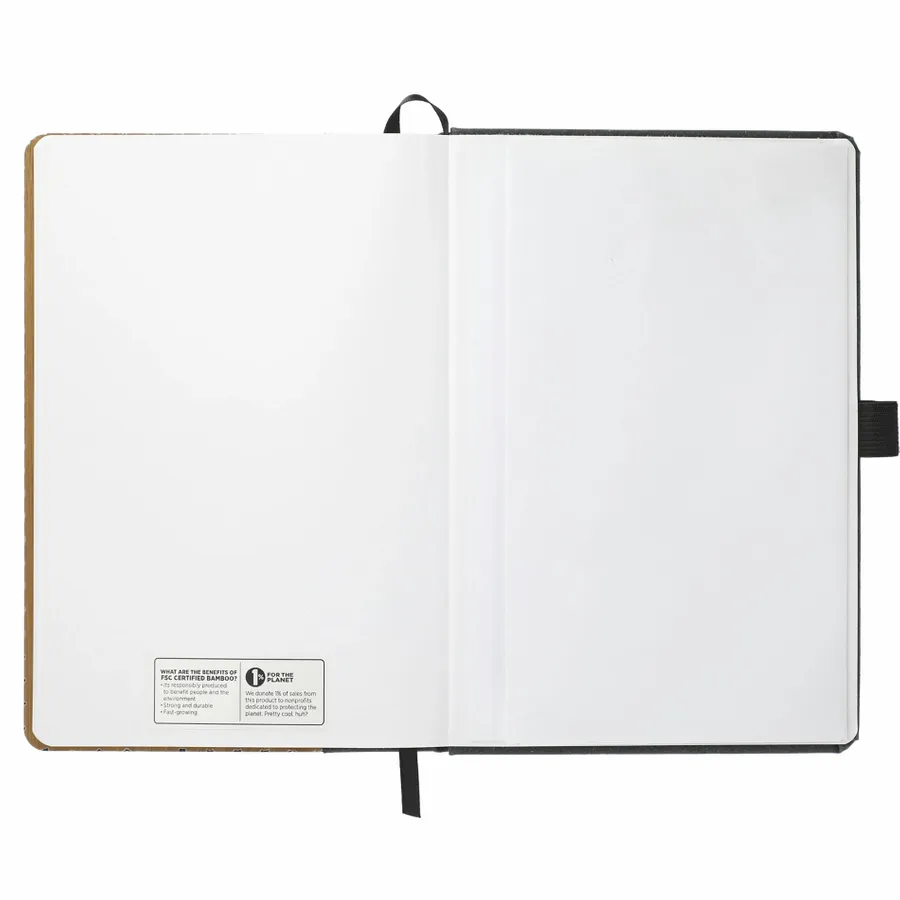 The 5.5 x 8.5 FSC Mix Bamboo Bound Journal features a unique bamboo cover with recycled leather accent. 80 sheets of recycled, white lined FSC Mix paper. Includes elastic closure, ribbon page marker and elastic pen loop.Through a partnership with 1% For The Planet, one percent of sales of this and all EcoSmart products will be donated to nonprofits dedicated to protecting the planet. Due to the nature of the material, there may be color variances.