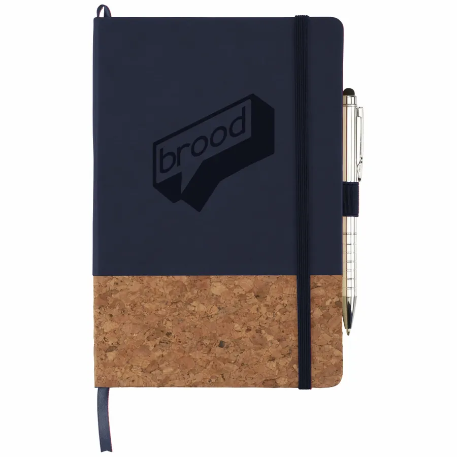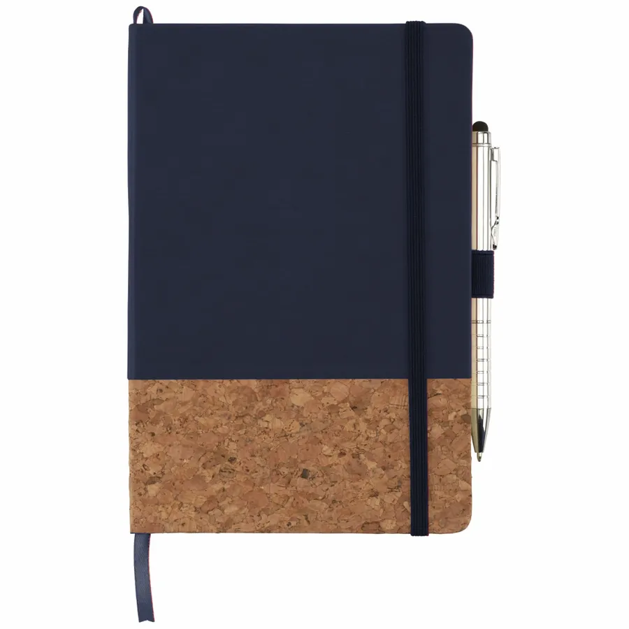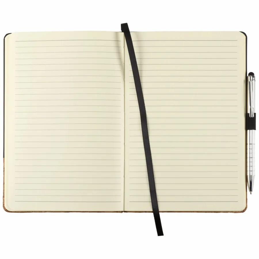 The 5.5 x 8.5 FSC Mix Lucca Cork Hard Bound Journal features a smooth polyurethane hard cover and cork-like bottom. This specialty Journal includes color matching elastic pen loop, elastic closure, and ribbon page marker. Includes 80 sheets of cream lined FSC Mix paper. Pen is not included.
