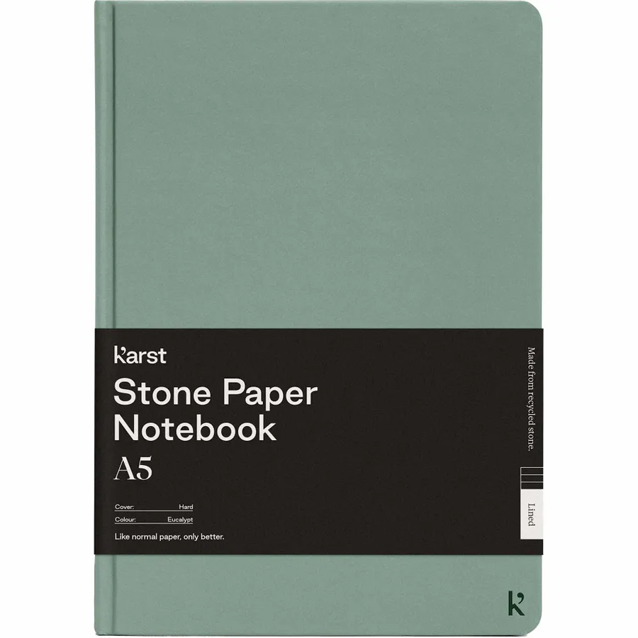 The Karst 5.5 x 8.5 Stone Bound Notebook is made for creatives by creatives. Featuring a water-resistant hard cover and pages, ribbon page marker and back document pocket. The smooth texture of the 72 sheets of white stone lined pages and flat-lay binding provide ample comfort and writing space for your notes and ideas. This stone paper holds a C2C Cradle to Cradle Silver Certification. That means if you do have to dispose of your Karst notebook; it is recyclable. Due to the nature of the material, there may be color variances on the cover.
