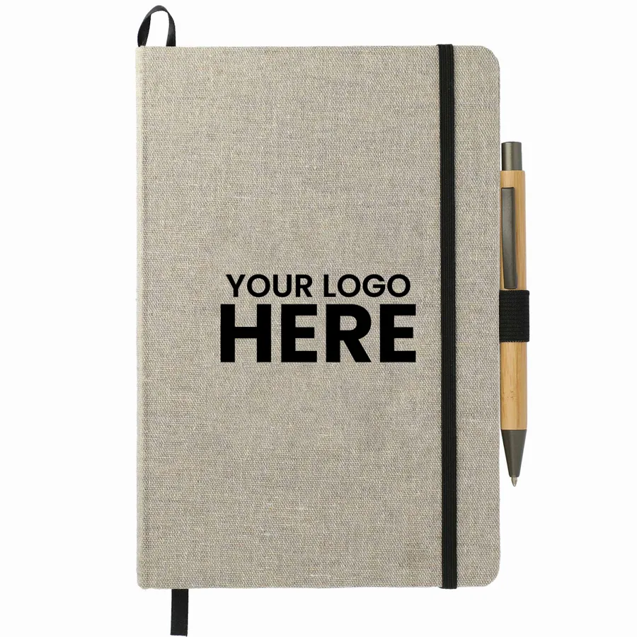 The 5.5 x 8.5 Recycled Cotton Bound Journal Set includes (2800-94) 5.5 x 8.5 Recycled Cotton Bound Journal and (1066-49) Bamboo Quick-Dry Gel Ballpoint. The 5.5 x 8.5 Recycled Cotton Bound Journal is the perfect journal for all of your notetaking needs. Features a recycled cotton, hard cover. Natural color elastic closure, pen loop and ribbon page marker. 80 sheets of FSC Mix cream lined paper. Back document pocket. FSC label printed inside. Through a partnership with 1% For The Planet, one percent of sales of this and all EcoSmart products are donated to environmental nonprofits.