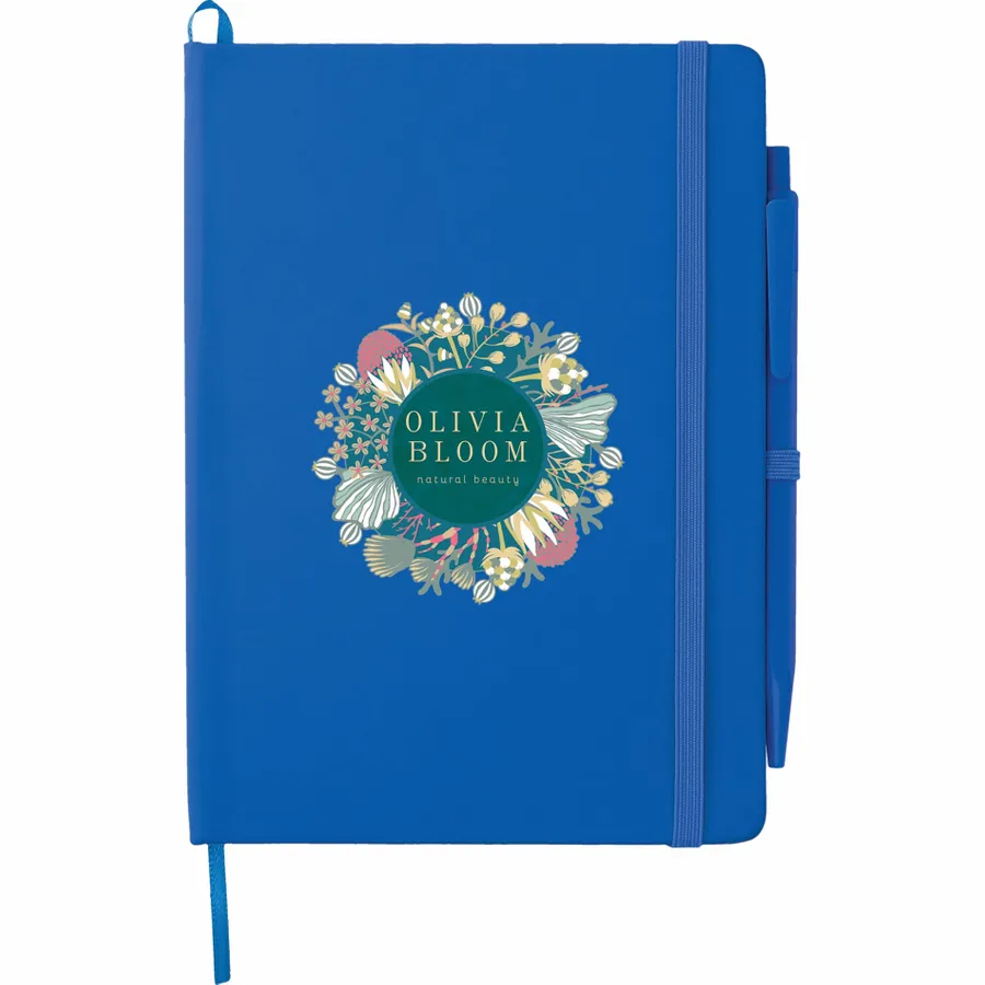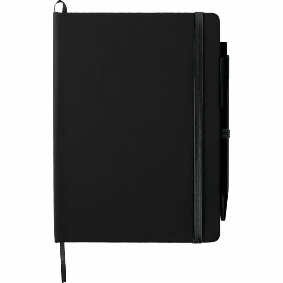 The Bullet 5 x 7 FSC Mix Prime Notebook With Pen is a hardbound notebook with color matching elastic closure, ribbon page marker, and pen loop. It contains 50 sheets of white lined FSC Mix pages and comes with a color matching pen with black ink cartridge. Note that pens are packed separately.