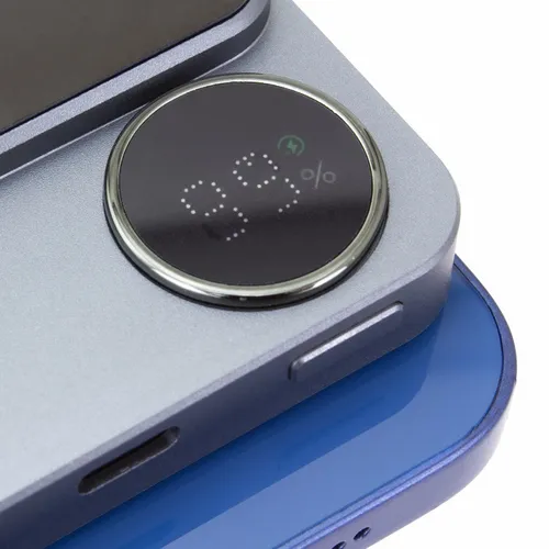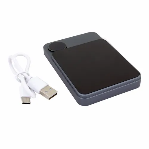 A slim and elegant power bank with a 5K charge, a partial metallic exterior, and an LED power-level display. Its modern style matches and compliments newer phone designs. The ports include a Type-C PD input and output and a USB port.