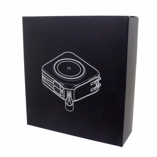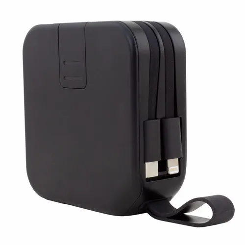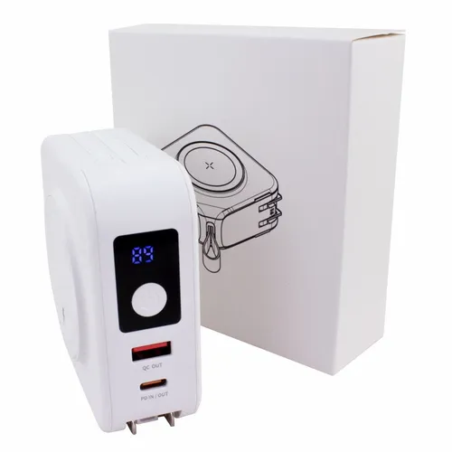 A wireless charging power bank that is perfect for business teams that need to travel extensively. It comes with built-in 8-pin style and Type-C cables as well as a flip-out AC plug. The front ports are QC out and PD in/out with an LED power-level display.