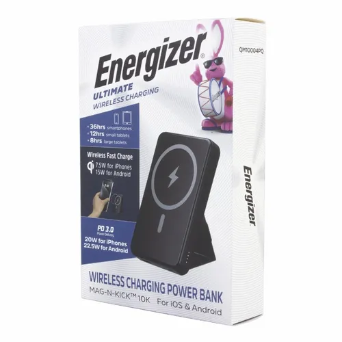 A great looking Energizer power bank with 10,000 mAh battery capacity. Magnetically holds to newer compatible phones. It also has a convenient foldout stand to prop up on a desktop surface to keep your hands free. It's a great device for daily use for any busy professional. Specifications: Model Name: QM10004PQ Cell Type: Lithium Polymer Battery Capacity: 10000mAh/38.5Wh(Max.) Rated Input: USB-C PD 5V/3A, 9V/2A Rated Output 1: USB-A 4.5V/5A, 5V/4.5A, 5V/3A, 9Vl2A, 12V/1.5A
